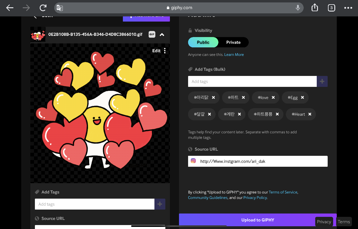 또 gif와 관련된 키워드를 입력했습니다. 하트를 안고있어서 하트, love, 사랑 등등.. 입력하였어요!